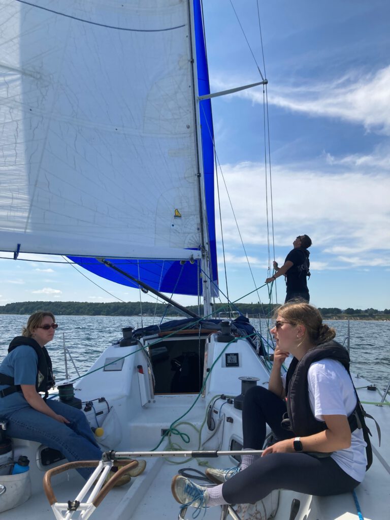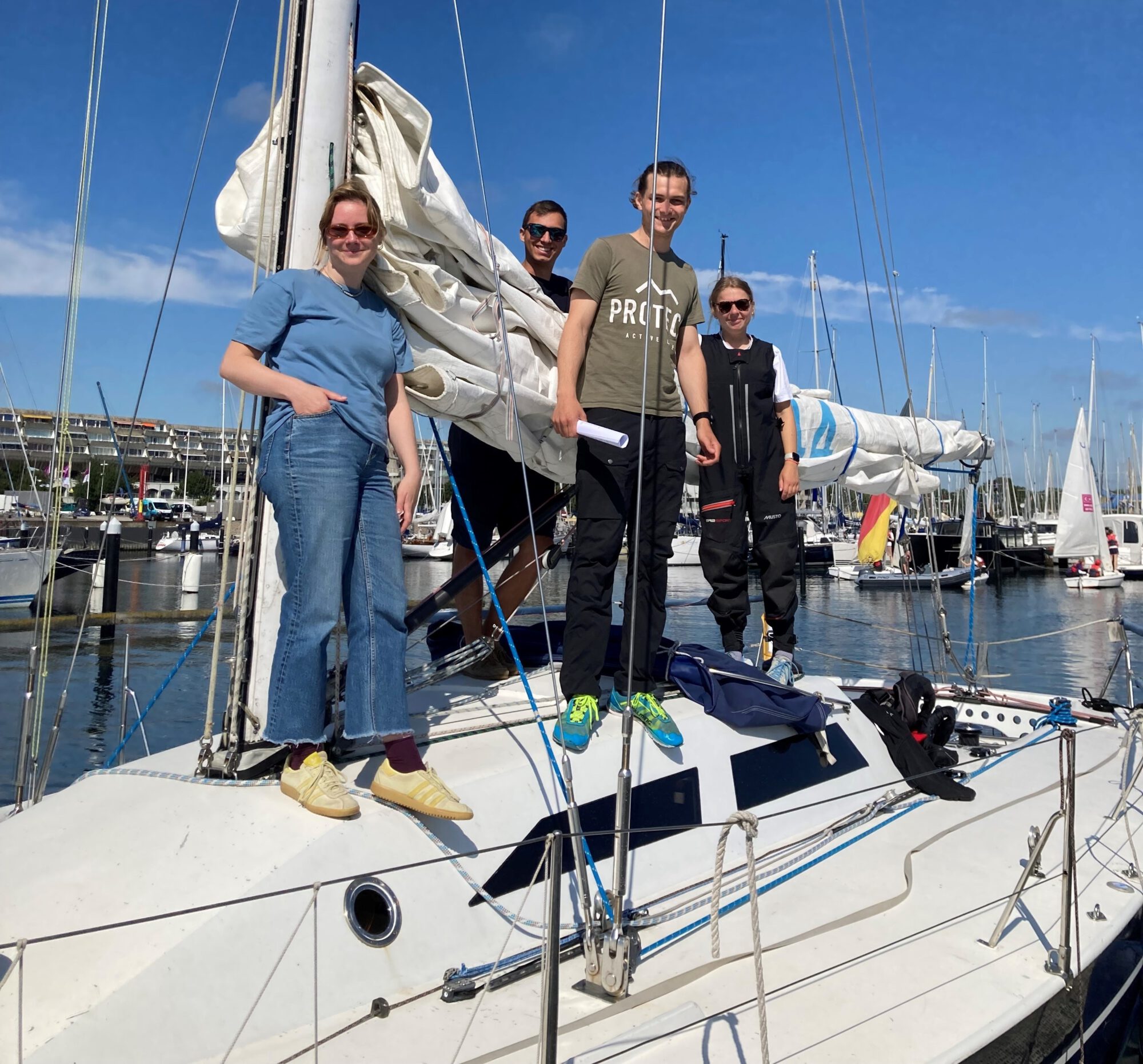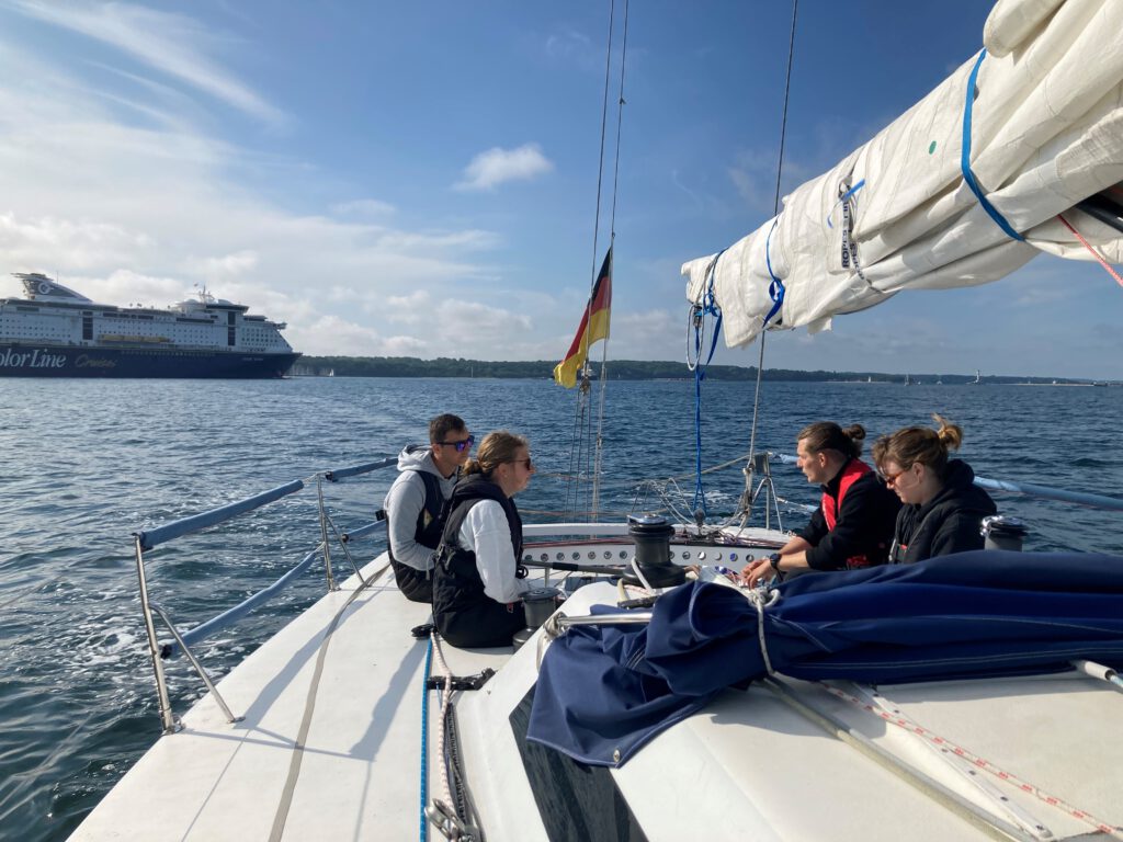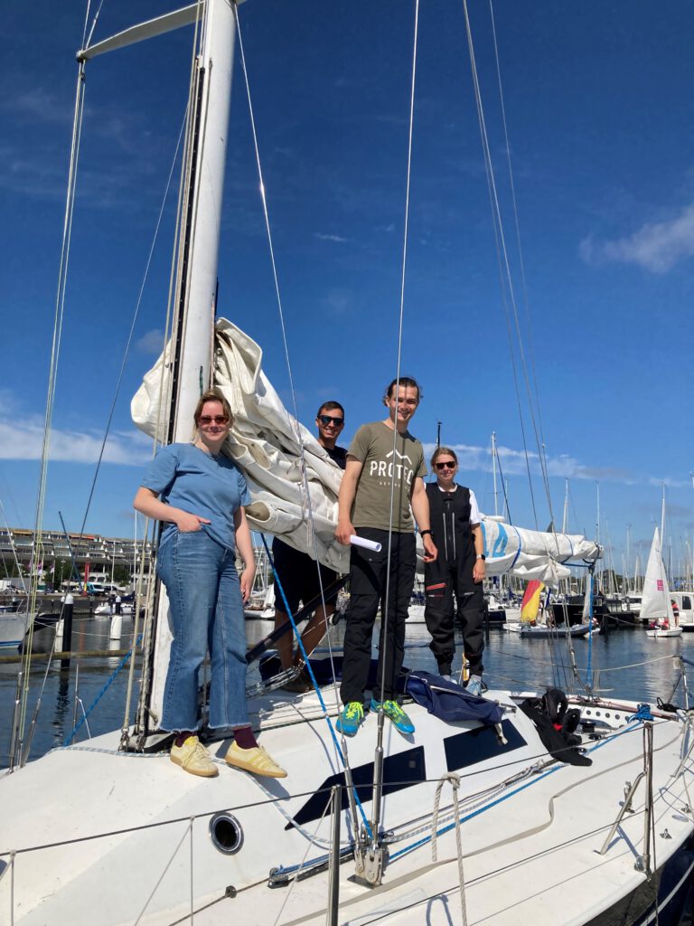 Dann ging auf einmal alles ganz schnell. Zwei Prüfer kamen an Bord, haben uns über den Ablauf aufgeklärt und los geht’s. Flo konnte direkt beim Ablegen mit dem „Eindampfen in die Vorspring“ glänzen. Kurz um die Ecke motort und es ging direkt weiter mit dem „Segel setzen“ (Groß und G3). Dann kamen noch einige weitere Segelmanöver wie „Beiliegen durch Beidrehen“ und „Wende“, bevor das gefürchtete Pflichtmanöver „Boje über Bord unter Segeln“ geprüft wurde. Direkt im ersten Anlauf klappte auch dies, sodass das sich anschließende „Boje über Bord unter Segel mit Maschinenunterstützung“ ein Spaziergang war. Die Prüfer hatten offensichtlich genug Segelmanöver gesehen und die Prüfung ging dann zu dritt unter Deck weiter (Flo mit den beiden Prüfern). Der Rest der Crew hat die Segel geborgen und die Kick unter Maschine wieder Richtung Hafen geschippert. Hier hat Flo dann wieder übernommen und längsseits unterm Kran angelegt. Fertig … herzlichen Glückwunsch … die Prüfer haben das Schiff wieder verlassen und sind direkt zum nächsten Schiff übergestiegen. Wir haben uns dann erst einmal mit einem Fischbrötchen gestärkt und das Erlebte Revue passieren lassen.